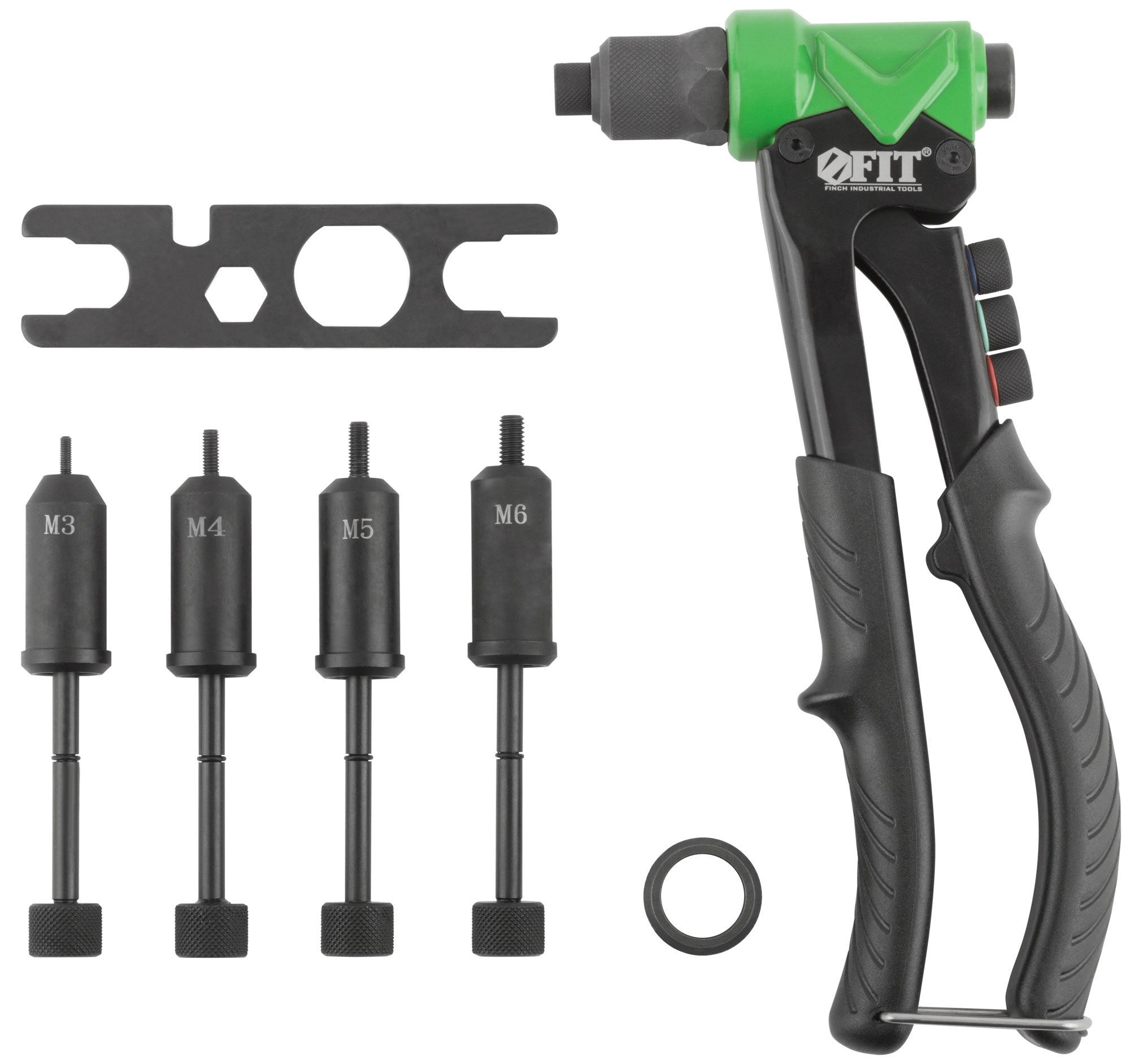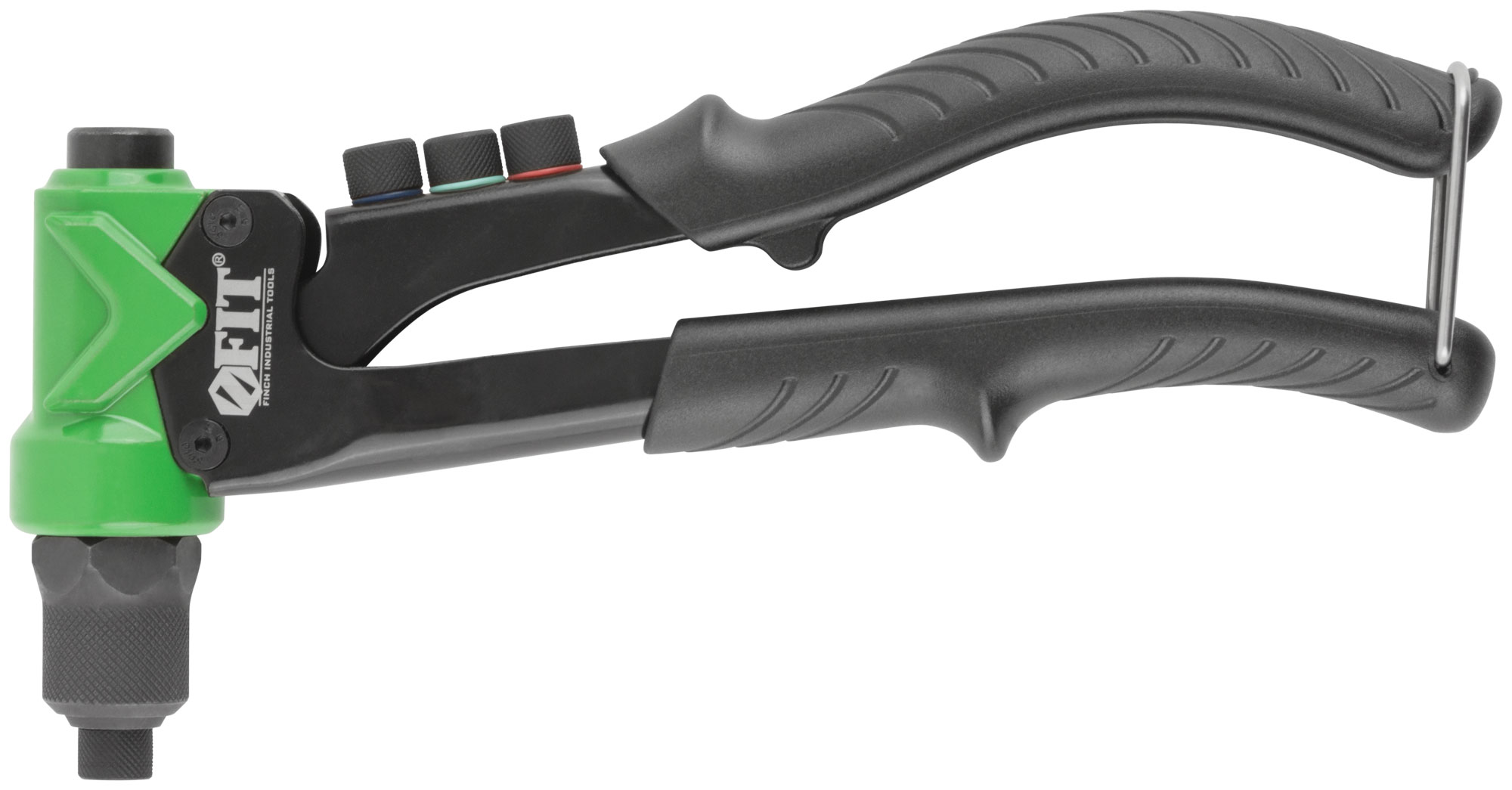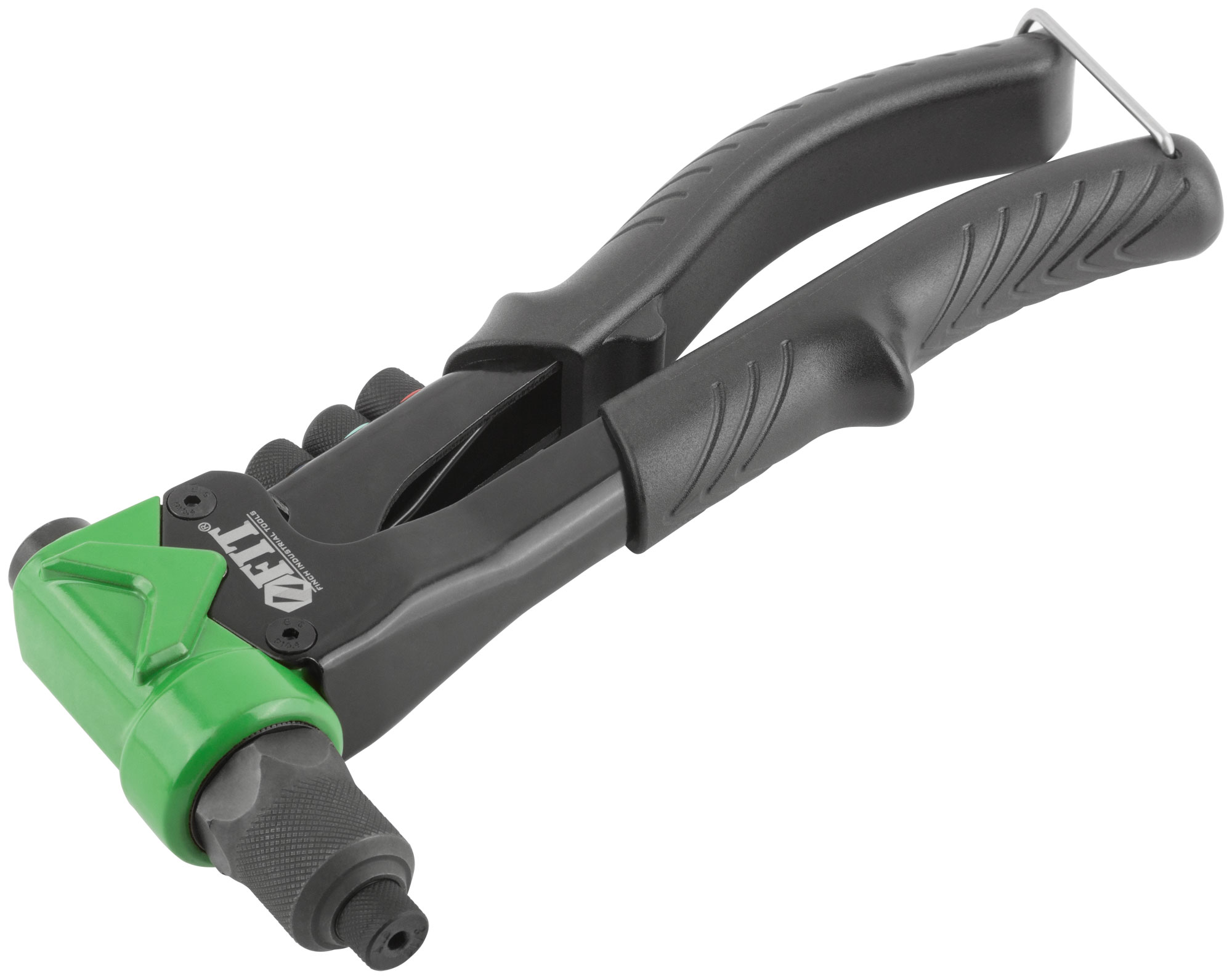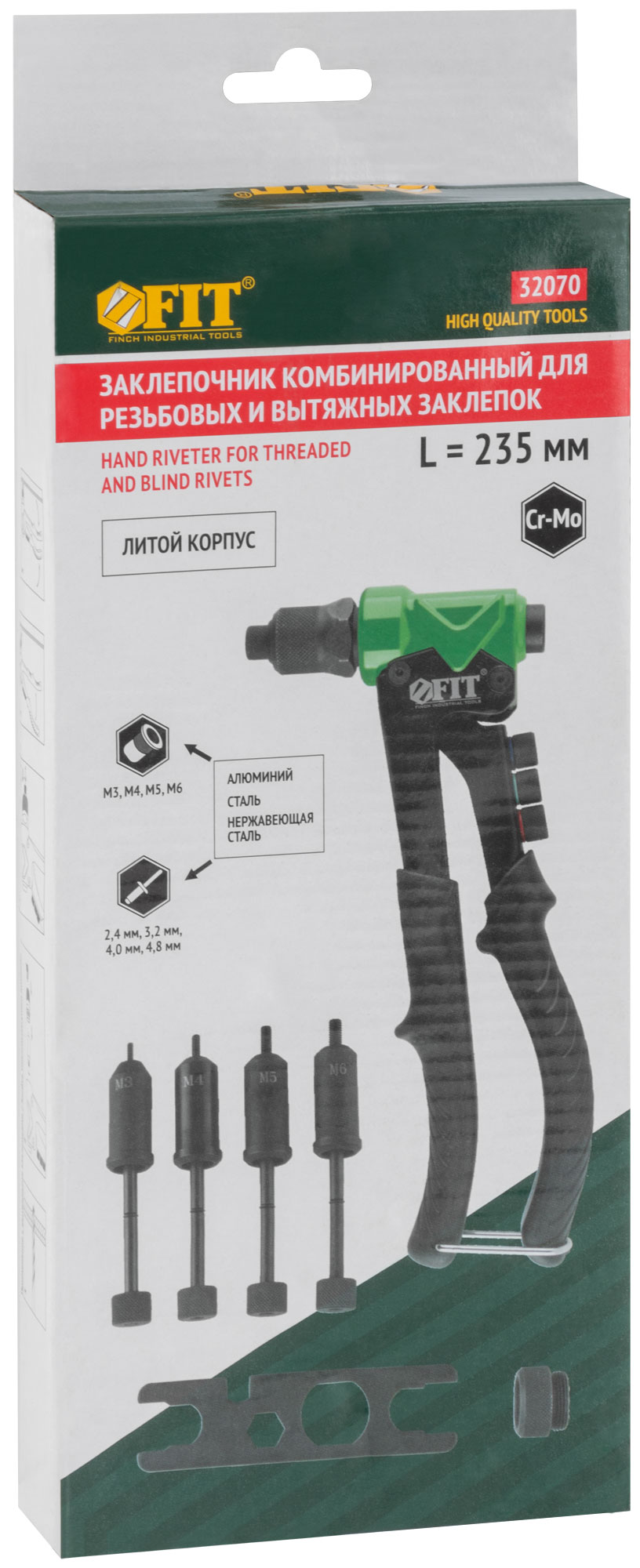Профи. Для скрепления листовых материалов с помощью вытяжных и резьбовых заклепок из алюминия, стали и нержавеющей стали. Усиленная конструкция. Литой корпус. 4 быстросменных насадки для вытяжных заклепок, 4 насадки для резьбовых заклепок и ключ для смены насадок в комплекте. Материал: корпус из алюминиевого сплава, ручки из инструментальной стали с ПВХ накладками, насадки для вытяжных заклепок из инструментальной стали, насадки для резьбовых заклепок из хром-молибденовой стали. Упаковка: картонная коробка.