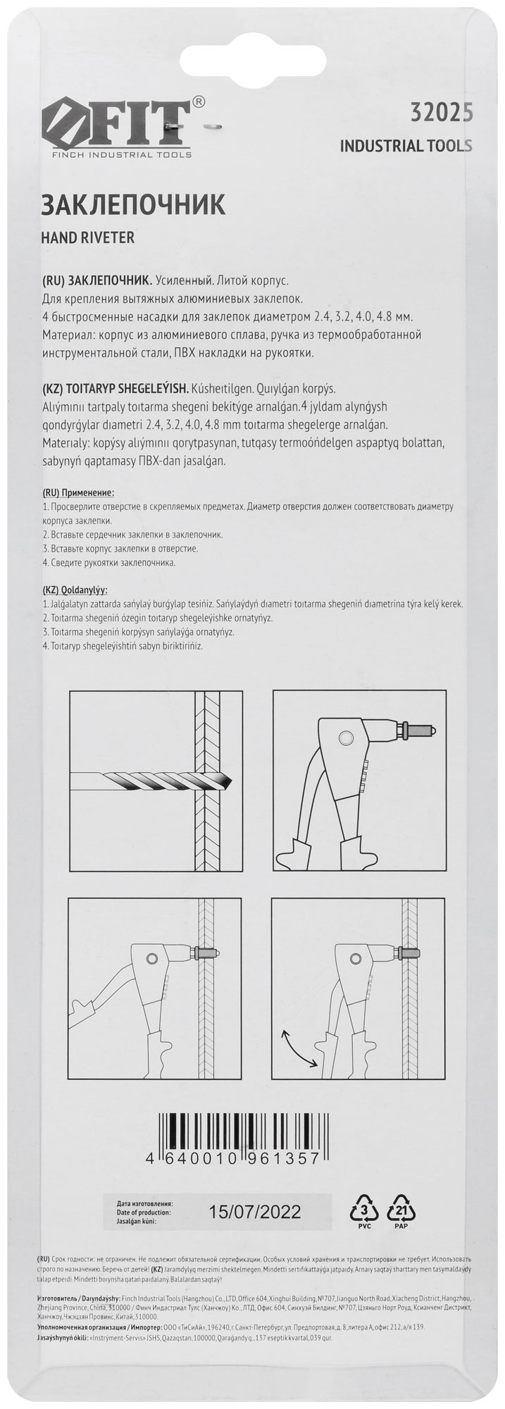 Профи. Для крепления вытяжных алюминиевых заклепок. 4 быстросменных насадки, пружинный рычаг для выброса сердечника от заклепок. Материал: литой корпус из алюминиевого сплава, рукоятка из инструментальной стали с виниловым покрытием. Для профессионального использования. Упаковка: блистер.