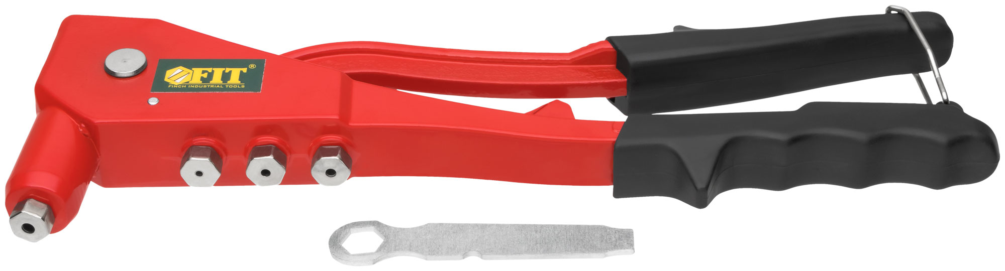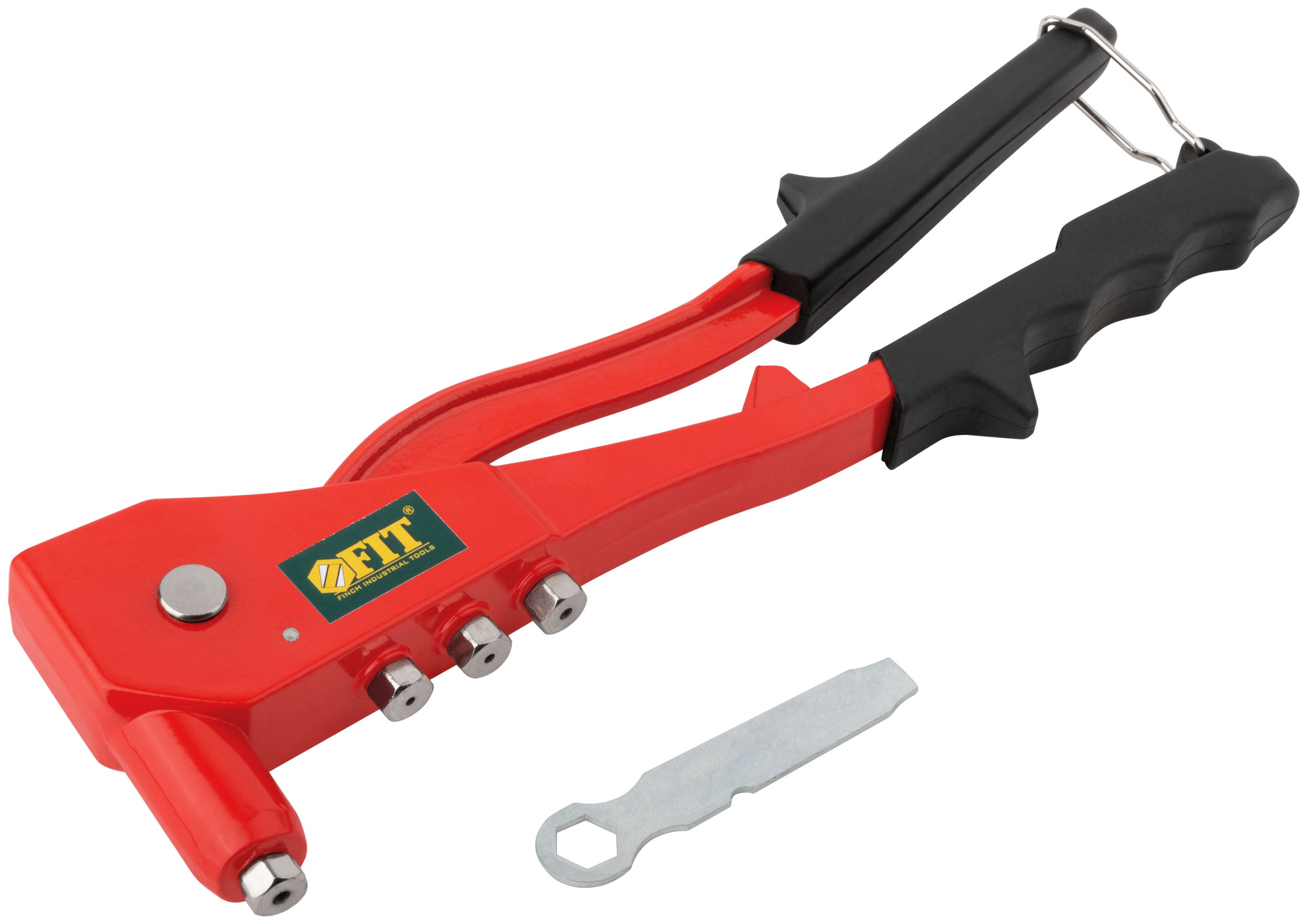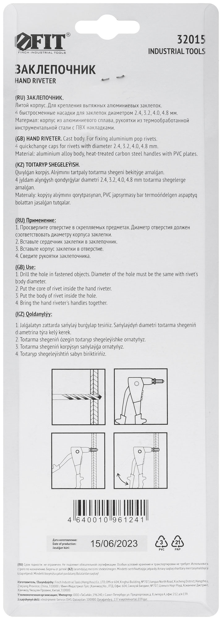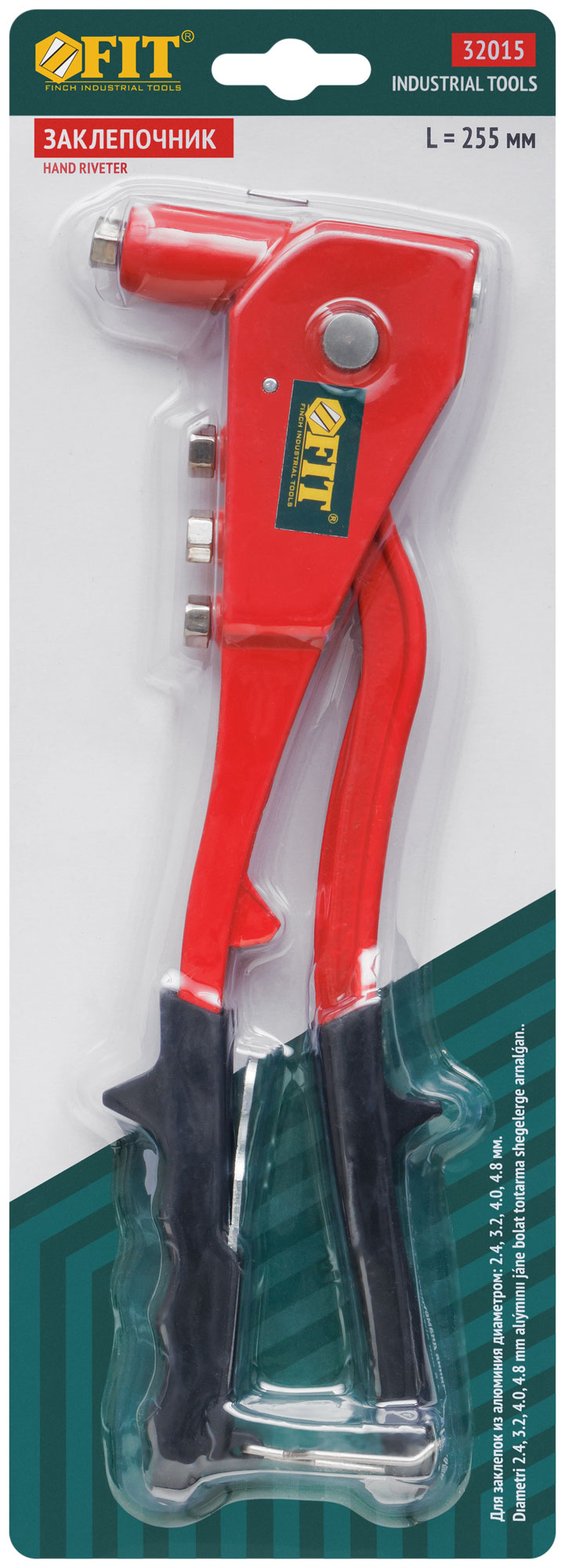 Профи. Для крепления вытяжных алюминиевых заклепок. 4 быстросменных насадки, пружинный рычаг для выброса сердечника от заклепок. Материал: литой корпус из алюминиевого сплава, рукоятка из инструментальной стали с покрытием из ПВХ пластика. Упаковка: блистер.
