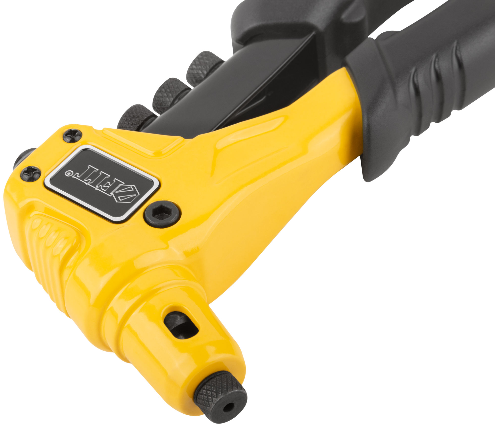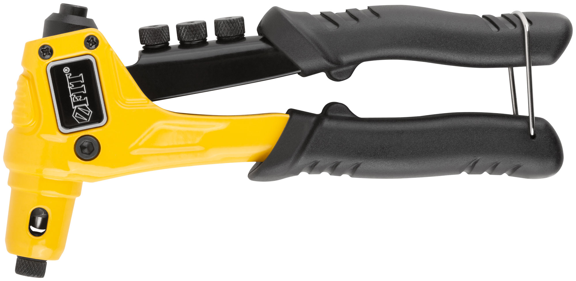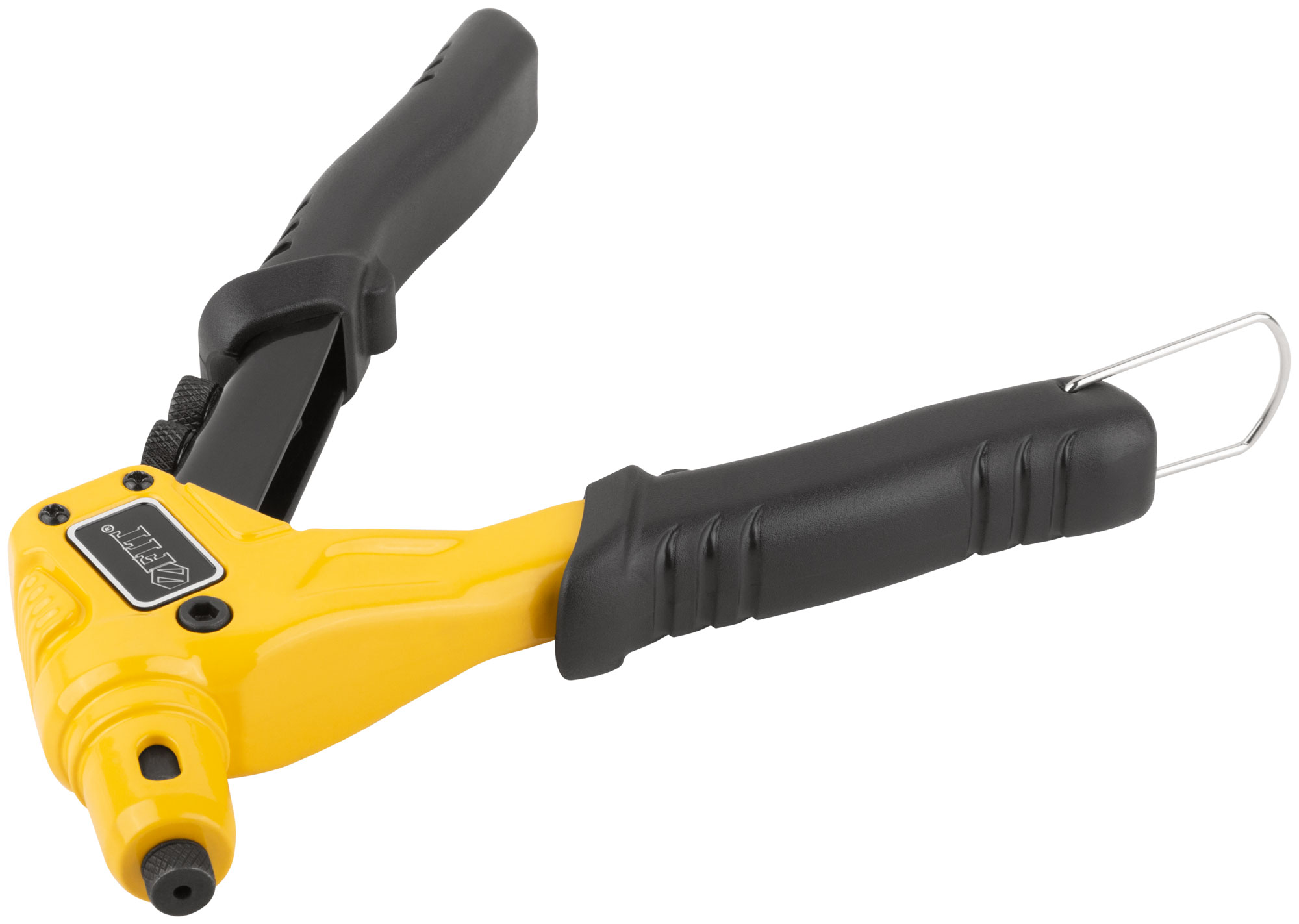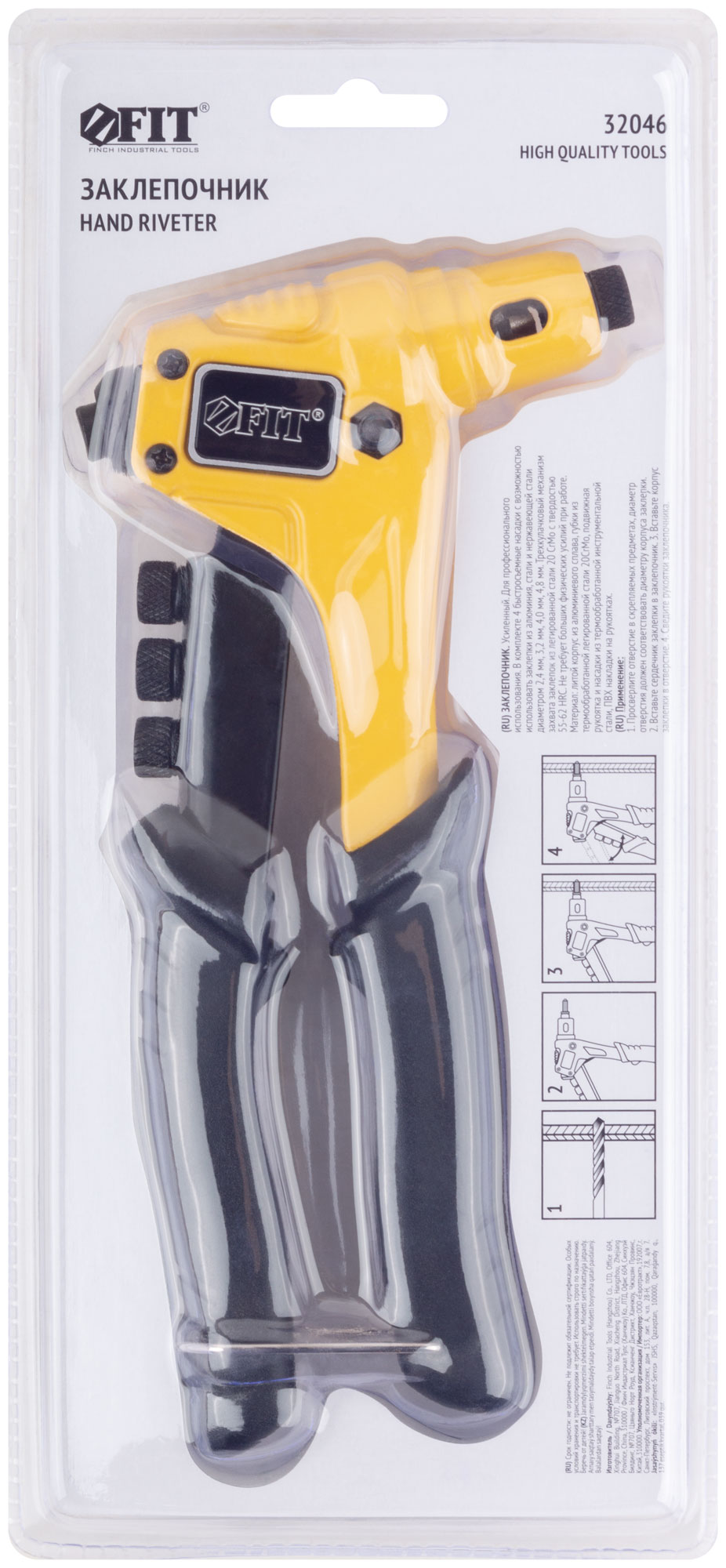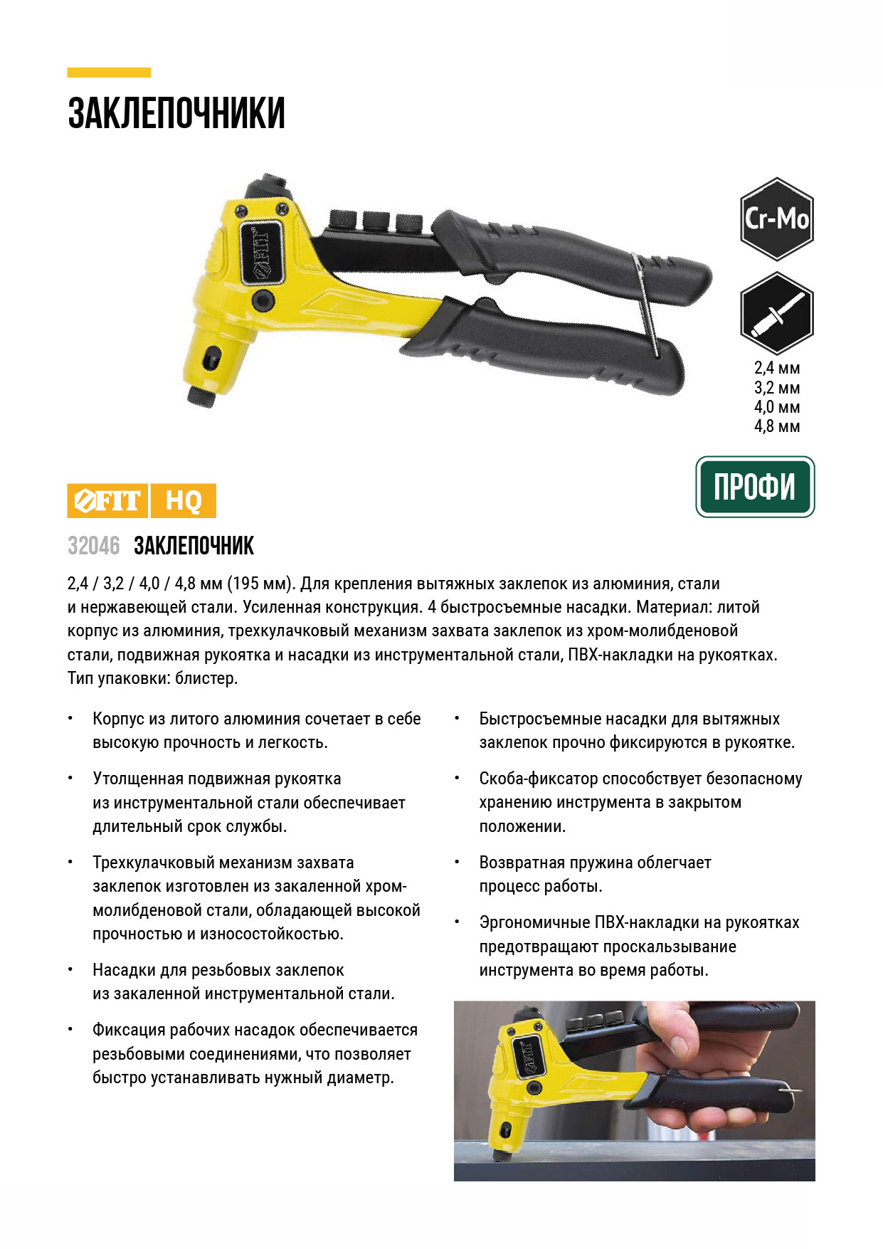 Профи. Для крепления вытяжных заклепок из алюминия, стали и нержавеющей стали. Усиленная конструкция. 4 быстросъемные насадки. Материал: литой корпус из алюминиевого сплава, трехкулачковый механизм захвата заклепок из хром-молибденовой стали, подвижная рукоятка и насадки из инструментальной стали, ПВХ накладки на рукоятках. Упаковка: блистер.