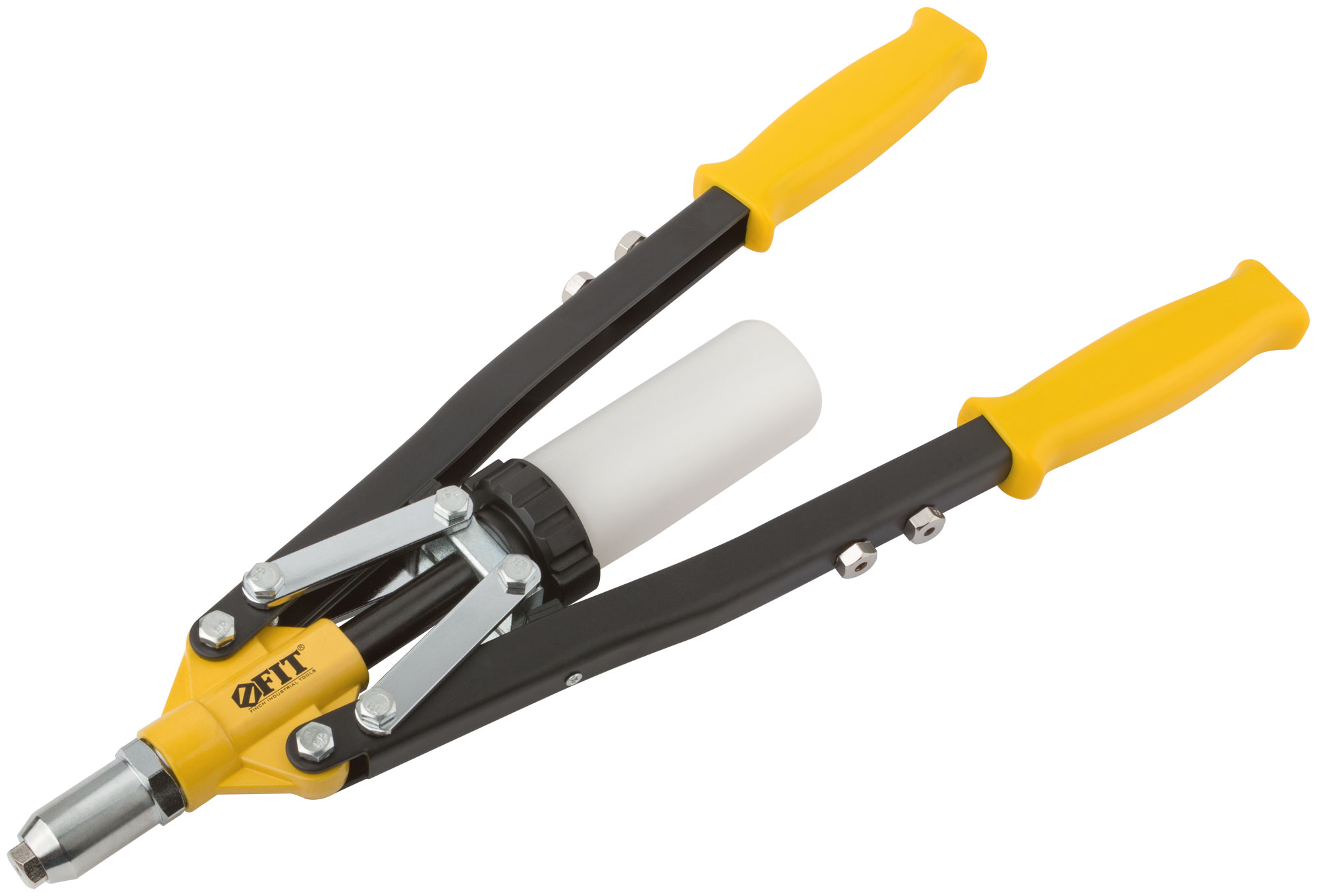 Для крепления вытяжных заклепок из алюминия, стали и нержавеющей стали. Усиленная конструкция. Пять сменных насадок для разных диаметров заклепок. Регулировка захвата заклепки. Пластиковый контейнер для сбора отработанных сердечников заклепок. Материал: инструментальная сталь, пластиковые рукоятки. Упаковка: картонная коробка.