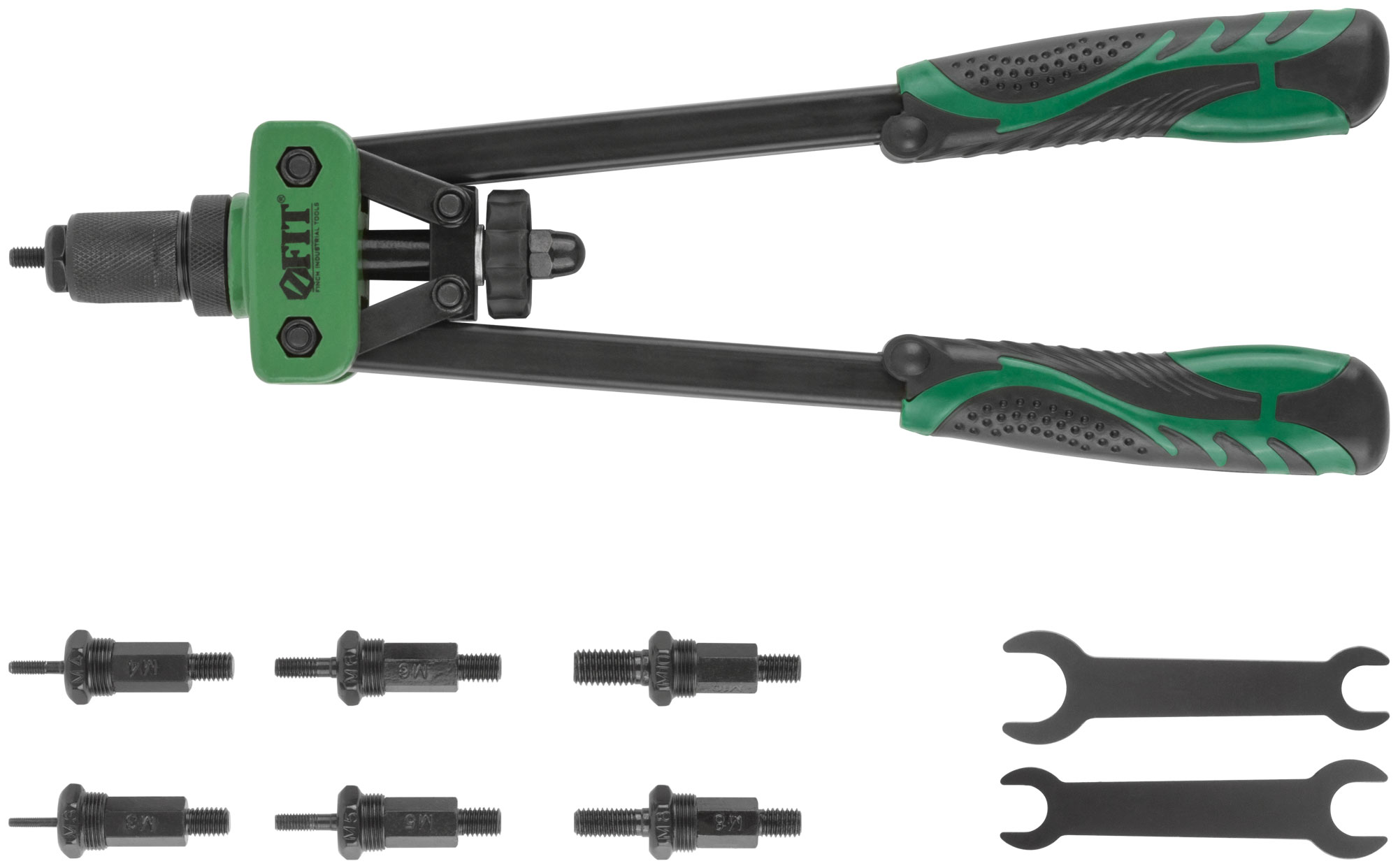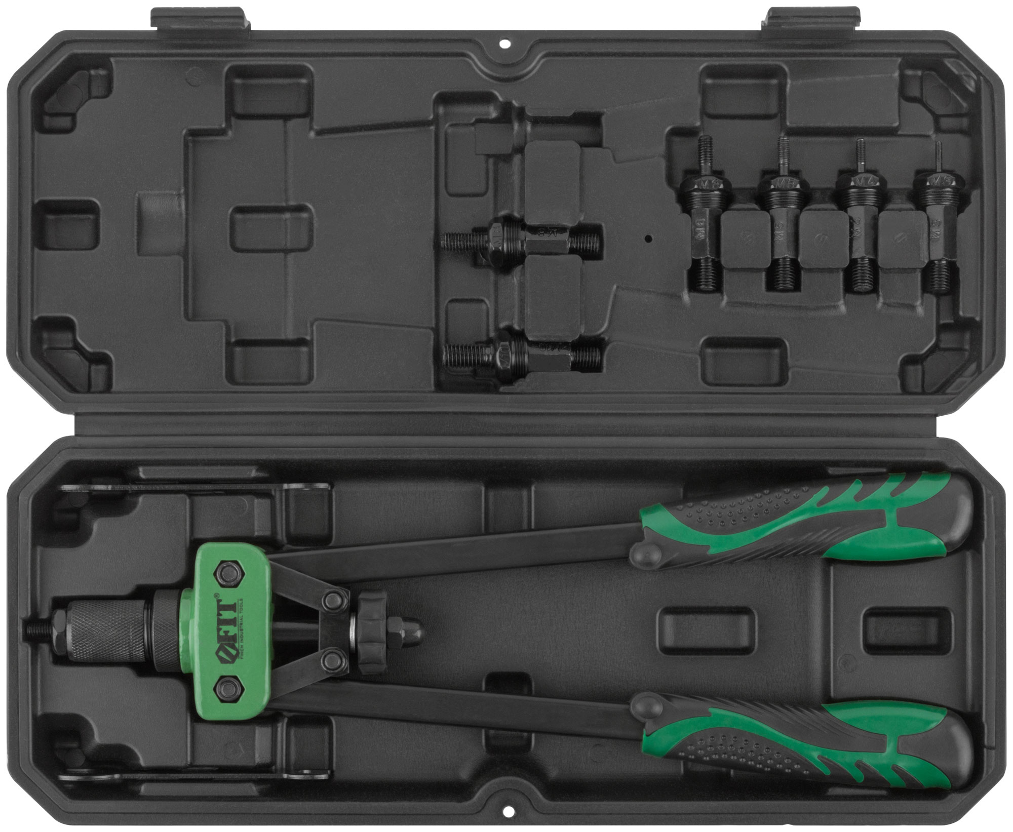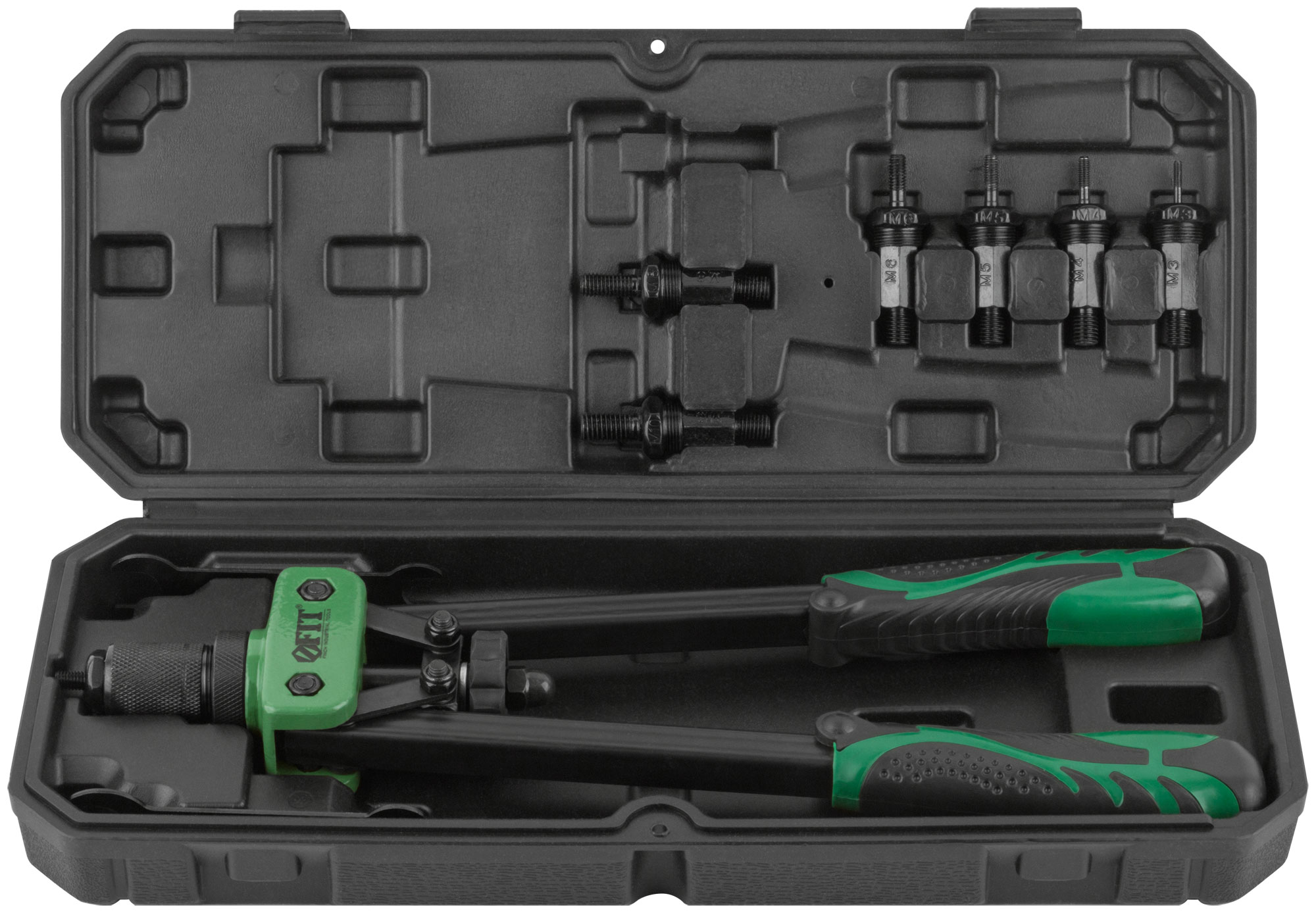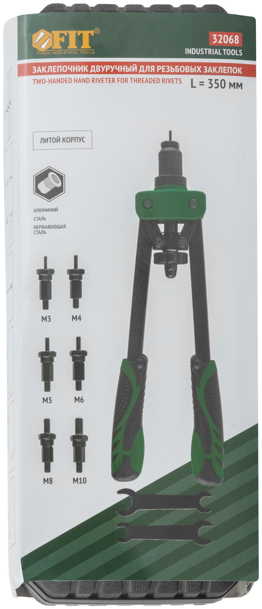 Профи. Для скрепления листовых материалов с помощью резьбовых заклепок из алюминия, стали и нержавеющей стали. Усиленная конструкция. Литой корпус. 6 сменных насадок и два ключа для смены насадок в комплекте. Материал: корпус из алюминиевого сплава, насадки из инструментальной стали, ручки из инструментальной стали с черненым покрытием, пластиковые прорезиненные накладки на ручки. Упаковка: пластиковый кейс.